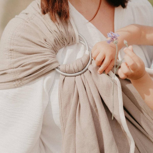 Idéal pour l'allaitement, le porte-bébé à anneaux vous permet d’allaiter sans être vu lorsqu’on rabat le pan de tissu sur l’épaule.