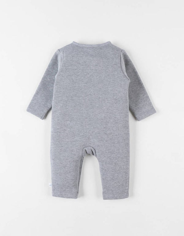 La combinaison en sweatoloudoux gris chiné tout doux se ferme par des boutons-pression au col et à l'entre-jambe pour faciliter l'habillage.