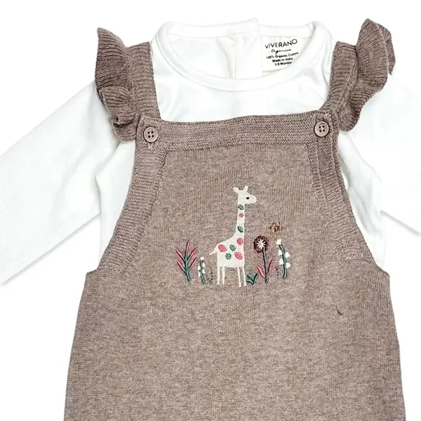 Combinaison pour bébé en tricot 100 % coton biologique ornée de délicates broderies girafes et florales et de volants sur les épaules. - Boutons à pression à l'entrejambe pour changer facilement les couches. - L'ensemble comprend un body à manches longues de couleur blanc cassé polyvalent. - Coton biologique respirant, confortable et douillet. - Écologique, sans produits chimiques et non toxiques, bon pour la peau délicate de bébé. - Vêtements biologiques pour bébés lavables en machine, durables et durables. - Produit de manière éthique et amoureuse en Inde. Viverano, une marque américaine, a été fondée en 2013 avec l'idée simple de produire des vêtements pour bébés écologiques.