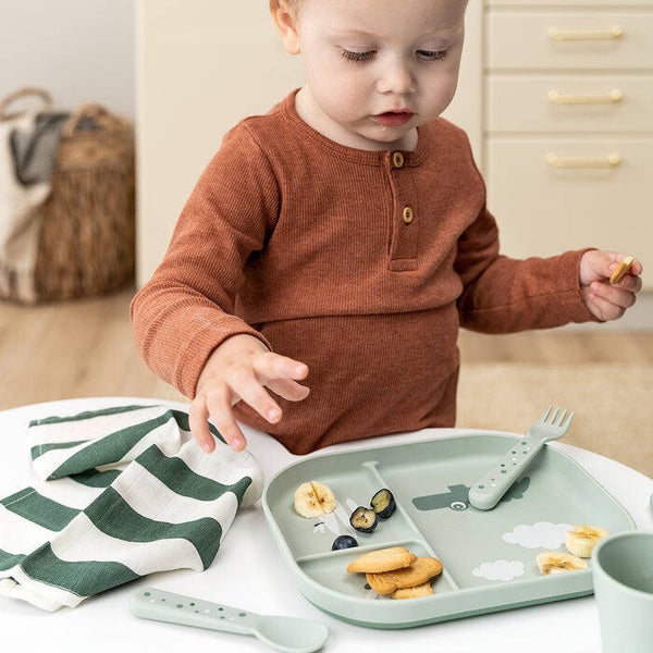 Assiette bébé compartimentée Foodie Croco vert, de la marque Done by Deer.