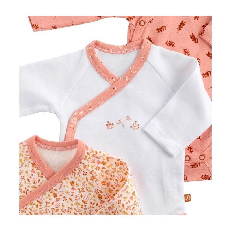 Les bodies Esmée sont vendus par lot de 3 pour permettre aux parents de changer bébé plusieurs fois bébé dans la journée. Leur forme croisée est très pratique et recommandée jusqu'au trois mois de l'enfant afin de faciliter l'habillage et le déshabillage. Les motifs de la collection Esmée viennent décorer les bodies de bébé.
