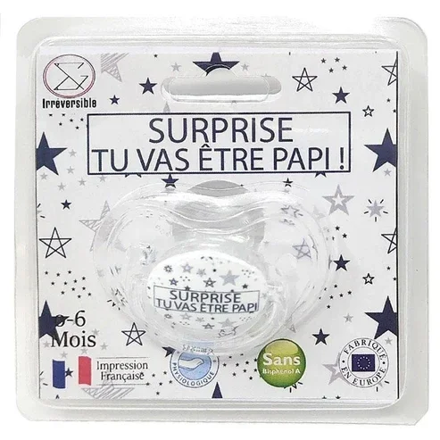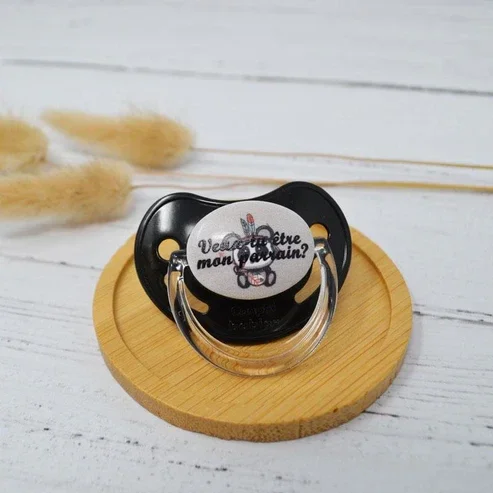 Sucette "Veux-tu être mon parrain ?" ou "Surprise tu vas être papi/mamie", de la marque Irréversible bijoux.