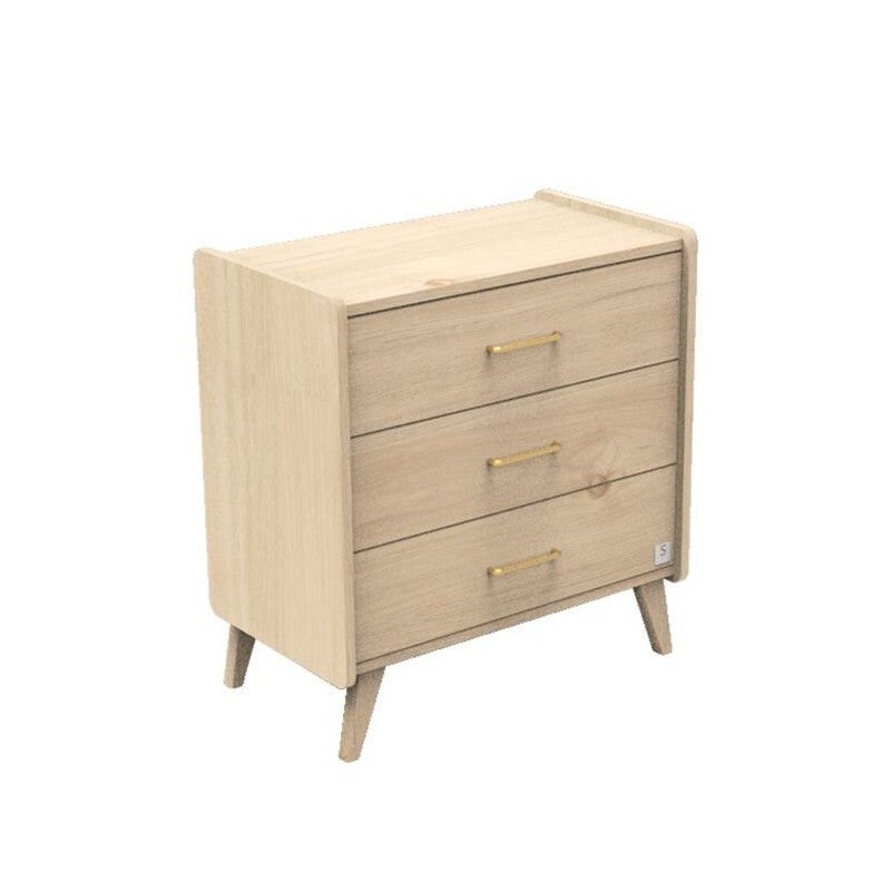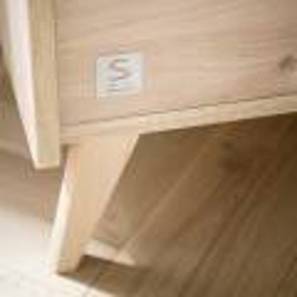 Côtés faces tiroirs, dessus et dessous en panneaux de particules revêtus de papier décor chêne Suave, chants décor bois.