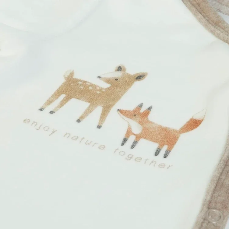 Découvrez notre adorable pyjama bébé sur le thème de la nature, conçu pour envelopper votre petit trésor de douceur et de chaleur. Fabriqué avec soin au Portugal, avec un motif enchanteur un renard et une biche qui évoquent les forêts colorées et les promenades en plein air.