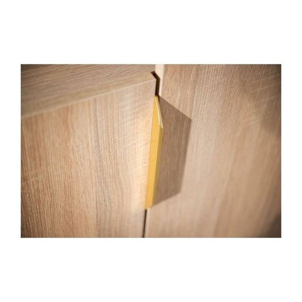 Portes, côtés, dessus, dessous, 4 tablettes intérieures, en panneaux de particules mélaminés décor Chêne doré, chants décor bois.