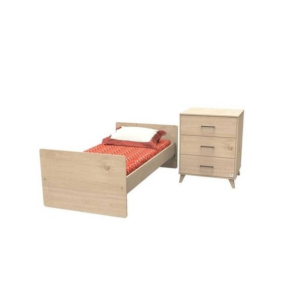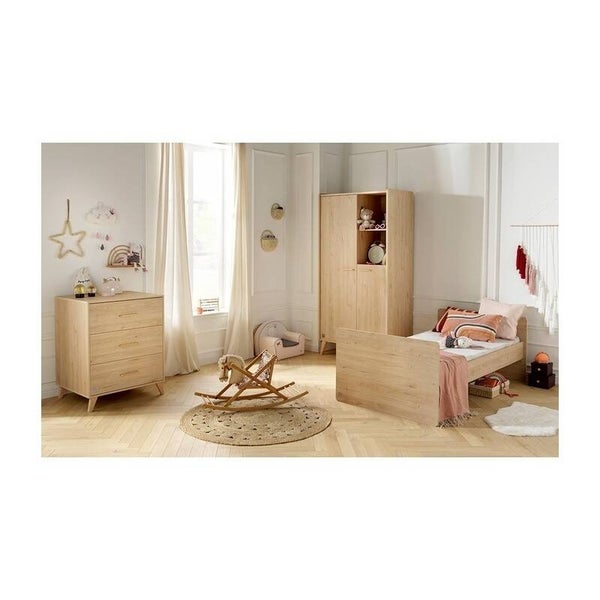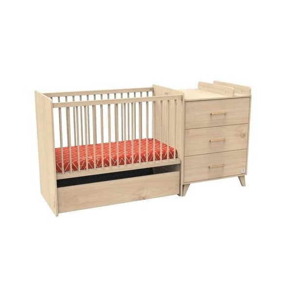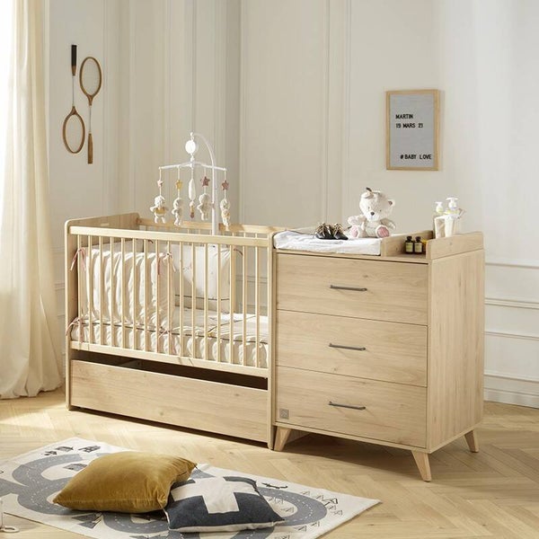 Dès la naissance, votre bébé profitera du confort d'un lit bébé 60x120 cm et vous, vous pourrez lui faire ses soins en toute sécurité sur le meuble à langer aux nombreux rangements qui lui est accolé. Plus tard, cet ensemble se transforme en lit enfant 90x190 cm (sommier vendu séparément).