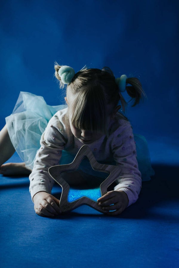 Découvrez la magie de l'émerveillement avec les objets sensoriels en forme d'étoile de la marque Petit Boum. Conçus avec un cadre en bois de hêtre, ces jouets s’adaptent parfaitement aux petites mains des tout-petits. Chacun d'eux est rempli d'un liquide coloré, de paillettes et d'un fluide fluorescent qui brille dans le noir, offrant une expérience visuelle fascinante.