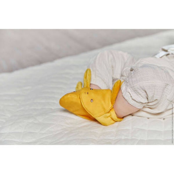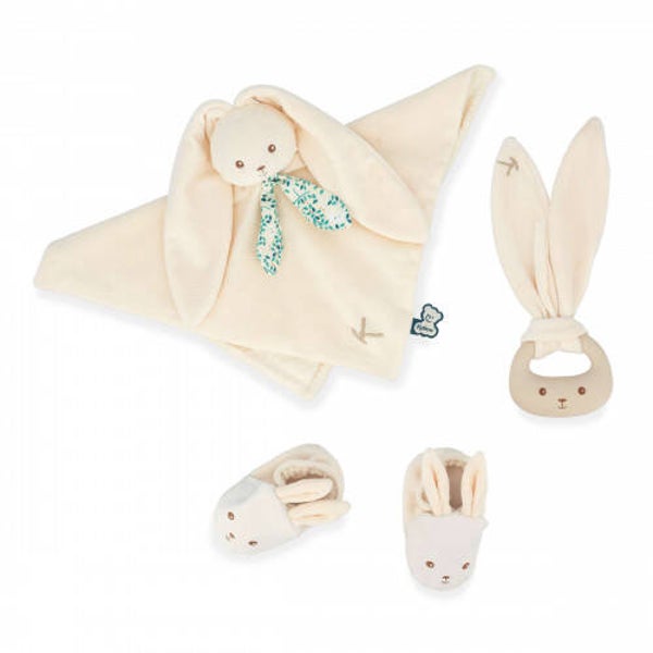 Ce coffret comprend aussi une paire de chaussons lapin taille 0-6 mois en bi-matières, avec du velours côtelé et de la suédine pour apporter confort aux petits pieds de votre bébé. Ils sont assortis avec le doudou mouchoir et l'anneau de dentition avec ses petites oreilles, total look lapinoo.