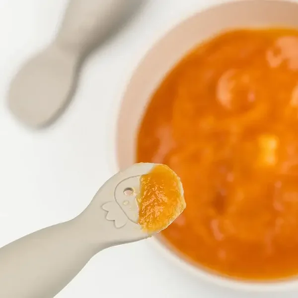 Les premières cuillères sont en silicone, douce, bonne prise en main pour les petites mains de bébé.
